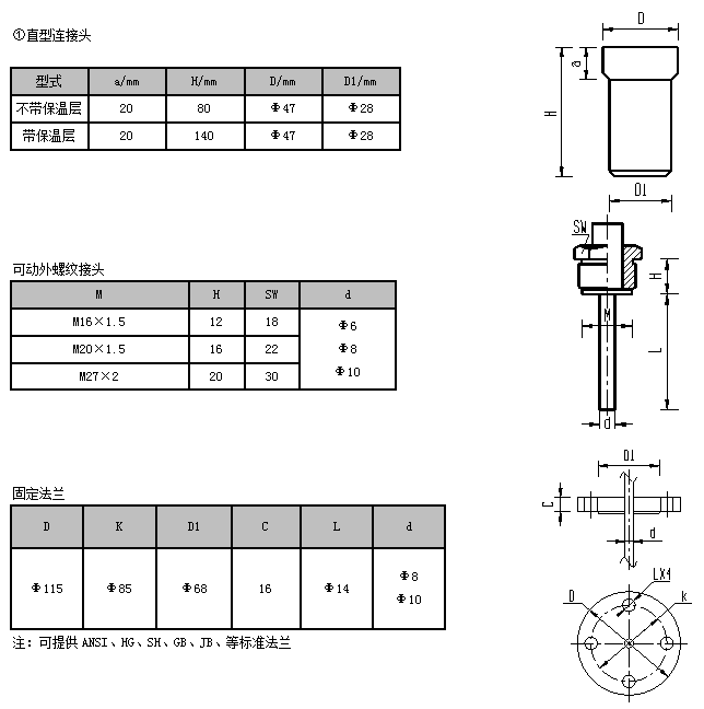 雙金屬溫度計(jì)有多種安裝固定型式滿足用戶需求,主要安裝形式包括:可動外螺紋、固定法蘭等。